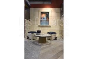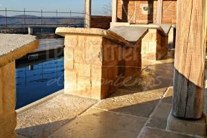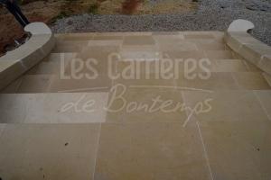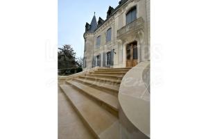 Ocre Clair finition aiguillee Light ocher needled finish Ocre Clair finition aiguillee Light ocher needled finish Piles de portail (pierre autre que du Limeyrat) Entrance in stone other than Limeyrat Parement mural éclaté usé en ochre moyen Wall cladding split tumbled medium ocher Parement mural éclaté usé en ochre moyen angles évidés Wall cladding split tumbled medium ocher angles in L shape Escalier ocre moyen à foncé fini brossé
