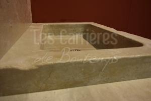 Evier vieilli en ocre moyen, façe avant layée, brossée , ¼ de rond irrégulier et arêtes brossée pour les rayures de l’égouttoir