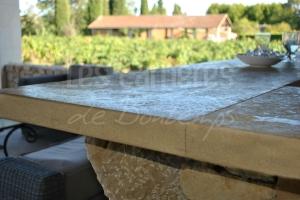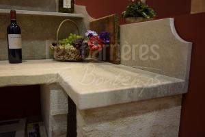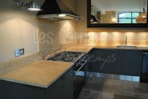 Comptoir et crédence, ocre clair, fini adouci en 4 cm d’ép ; Arête abaissée dessus /dessous