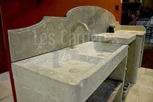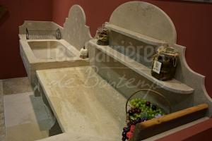 Aged sink in medium ocher, front part chiseled/brushed, ¼ top edge irregular, channels brushed for the drying area.