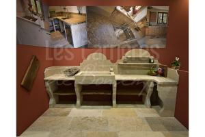 Comptoirs en ocre moyen fini adouci, 3 cm d’ép. Arête abaissée dessus /dessous